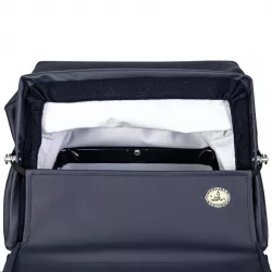 Capota abatible de Napa de alta gama azul marino con galón marino e interior de forro blanco. Cubrepiés napa alta gama azul marino con camafeo vintage. Capazo plegable de charol marino con serigrafía con logo. Interior en forro blanco. Colchón de espuma forrado en blanco.