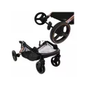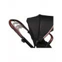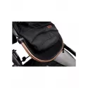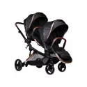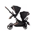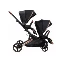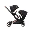 Dos asientos para cochecito. Equipado con un cinturón de seguridad de 5 puntos, un reposabrazos desmontable, una capota XL ajustable con ventana de visualización. El respaldo y el reposapiés se pueden ajustar desde la posición de asiento hasta la posición totalmente tumbada.