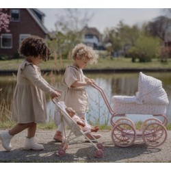 Sienta a tu muñeca o peluche favorito en este bonito cochecito de muñecas, con diseño Flores y bolsa a juego de Little Dutch. La correa asegura a tu muñeco y las 4 ruedas rosas facilitan los paseos. El carrito es plegable y perfecto para fomentar el juego imaginativo.