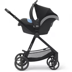 Incluye una capota amplia con ventana de visualización, fabricada en material impermeable y con protección solar UPF 50+. La cesta inferior es espaciosa y soporta hasta 3 kg de carga, ideal para llevar lo esencial. El conjunto incluye cubrepies, burbuja de lluvia y adaptadores para la silla de auto.