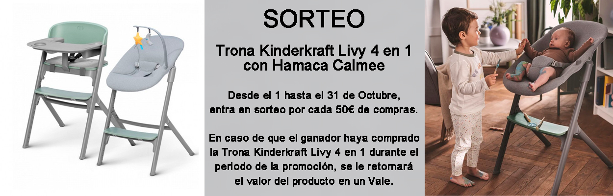 El premio es una Trona Kinderkraft Livy 4 en 1 con Hamaca Calmee. En el caso que el ganador haya realizado la compra del mismo producto que se sortea del 1 al 31 de Octubre de 2025, para optar a las participaciones, se podrá canjear por un vale para futura compra (sólo y únicamente en este caso se realizará un Vale).