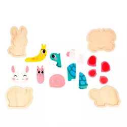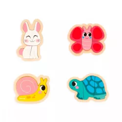 Están los animales favoritos de los más pequeñitos: un caracol de 2 piezas, una tortuga de 3 piezas, un conejo de 4 piezas y una mariposa de 5 piezas. Las piezas, que hay que posicionar en su sitio en un soporte de madera, son lo bastante grandes como para que el bebé pueda agarrarlas bien.