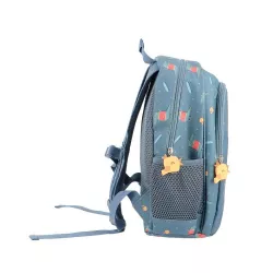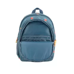 Un bolsillo frontal, que ocupa casi la altura de la mochila, con múltiples separadores interiores donde guardar lápices,cubiertos y pequeños artículos, que los peques tendrán más accesible