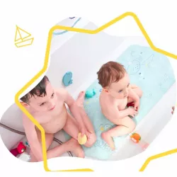 Tamanho XXL: 91 cm de comprimento - 28 ventosas antiderrapantes de grandes dimensões para um apoio ótimo no banho - Indicador de temperatura termo-sensível (quando a temperatura ultrapassa os 37°C) - Tratamento anti-bolor e de secagem rápida - Imagine aventuras com estampados e personagens marinheiros !