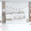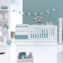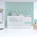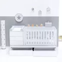 Berço convertível de estilo minimalista sem puxadores, lacado a mate com pormenores em branco. Deixe o seu bebé sonhar, brincar e descansar enquanto desfruta com ele desses momentos únicos da vida. Como o resto dos nossos berços convertíveis, adapta-se às diferentes etapas do bebé: 1ªetapa - berço: 70x140 cm berço com sistema de grades para cima e para baixo para facilitar o acesso ao berço. Mesa com 3 gavetas e um livro com dois espaços de grande capacidade. Um tapete muda-fraldas amovível e lavável ref. 631 pode ser instalado opcionalmente em cima da mesa e do livro. A parte inferior da cama de grades inclui 2 gavetas de encaixe com rodas para manter o quarto o mais organizado possível. 2ªfase - cama júnior: a calha da cama de grades pode ser retirada, deixando uma cama júnior com 70 x 140 cm. Opcionalmente, pode adquirir o corrimão júnior ref. JBJ502 para maior segurança da criança e a escada de brincar ref. JU400 para facilitar o acesso à cama. 3ªetapa- quarto júnior: o descapotável pode ser desmontado e transformado em 4 móveis diferentes para o quarto. Uma cama de 90 x 200 cm, uma mesinha com 3 gavetas, uma estante com rodas e uma secretária de 145 x 68 cm.