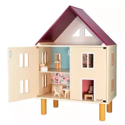 Decorada com bonitos padrões nas paredes e no chão, esta encantadora casa de madeira tem aberturas magnéticas e dispõe de uma grande área para brincar.