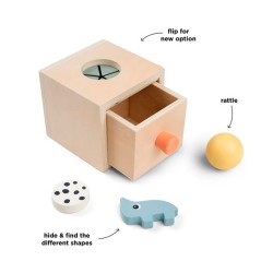 - Caixa de madeira estimulante para brincar às escondidas - Recomendado a partir dos 10 meses - Esconda e encontre os blocos e pratique a coordenação óculo-manual, a motricidade fina e a resolução de problemas - Inclui uma figura Nozo, uma bola com um guizo no interior e um bloco redondo preto e branco - Veja as coisas desaparecerem, encontre-as e aprenda que elas reaparecem - O guizo da bola estimula o sentido da audição do seu bebé - Vire a caixa ao contrário para obter uma forma mais desafiante - Experimente também com um lenço de brincar ou um pano para puxar as coisas para fora - Feito de madeira de origem responsável e pintado com tinta à base de água sem substâncias nocivas, é um brinquedo seguro para as crianças