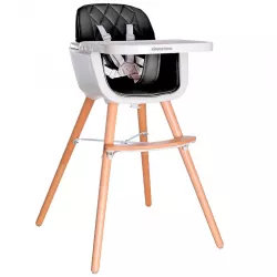 Assento estofado em pele Arnês ajustável de 5 pontos Pernas em madeira natural Pés antiderrapantes Tabuleiro ajustável em 3 posições Reforço para evitar a abertura devido ao desgaste Fácil de limpar Apoio para os pés Evolutiva Aprovada até aos 60 meses Peso 4,7 kg Largura 55cm Comprimento 55cm Altura 83,5 cm