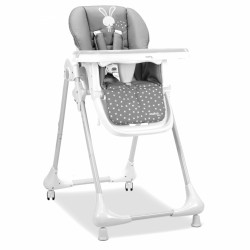Esta prática cadeira alta é segura e divertida graças ao seu estampado; perfeita para o dia a dia graças ao seu pequeno tamanho dobrável e às rodas para facilitar o transporte. Tem um encosto reclinável em 3 posições, é regulável em altura em 7 posições, sistema de segurança antiderrapante, grande tabuleiro duplo amovível e regulável.