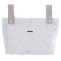 Pode ser fixada a qualquer tipo de carrinho de bebé e também pode ser transportada ao ombro graças a uma correia no interior.