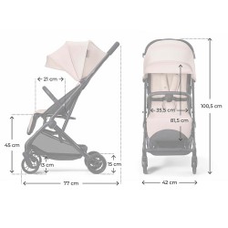 - Apenas 7,3 kg: leve e fácil de transportar - Dobra-se rapidamente com uma mão, mesmo com a criança nos braços - Dobra-se de forma compacta: cabe numa pequena mala (33 × 57,3 × 61,5 cm) - Reclina-se para a posição deitada: conforto desde o nascimento - Rodas TPR duráveis e travão central: ideal para a cidade - Inclui alça de transporte