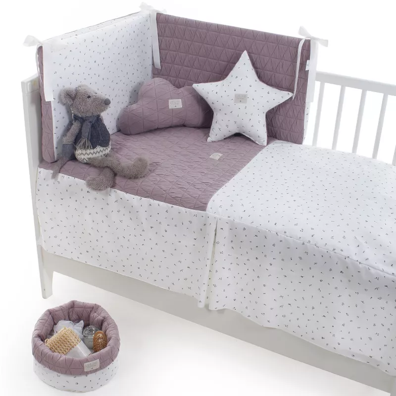 Pack de edredão e protetor amovível com tecido lavável e enchimento incluído. SEM almofada. Com o protetor evita as correntes de ar para o seu bebé e, ao mesmo tempo, protege-o de possíveis choques com os lados da cama, evitando que os seus braços e pés fiquem presos na cama. Esta peça adapta-se de forma segura e fácil à estrutura do berço. O acolchoado tem um desenho coordenado com o protetor. No inverno, o enchimento mantém o bebé quente e aconchegado. No verão, quando o enchimento é retirado, a capa pode ser utilizada como uma colcha leve. Com certificação Oeko-Tex Standard 100, o que significa que todos os materiais são testados e não contêm substâncias nocivas. Se quiser, pode encontrar outros artigos interessantes da coleção, nesta mesma linha e com a mesma qualidade. Tudo fabricado e desenhado em Espanha com os melhores materiais e tecidos da mais alta qualidade.