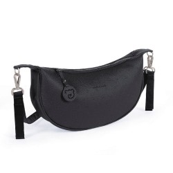 Esta bolsa de ombro foi concebida para transportar os acessórios do bebé durante os passeios ou viagens. É fabricada em pele sintética preta com uma textura granulada. Tem uma grande capacidade de arrumação e permite organizar artigos como fraldas, roupa, toalhetes, biberões e objectos pessoais.