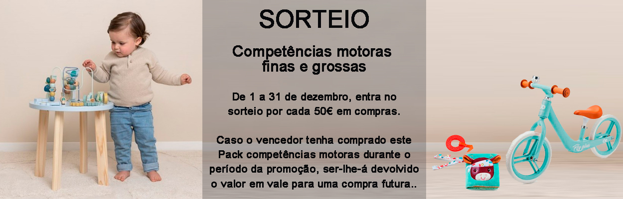 O prémio é um Pack Motricidade fina e grossa a partir dos 6 meses. No caso de o vencedor ter feito uma compra do mesmo produto que está a ser sorteado de 1 a 31 de dezembro de 2025, para se qualificar para as participações, pode ser trocado por um voucher para uma compra futura (apenas e só neste caso será feito um Voucher).