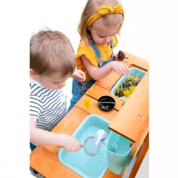 Este autêntico laboratório de descoberta da natureza está perfeitamente equipado para satisfazer todos os aventureiros do jardim com os seus dois lavatórios e dois recipientes de plástico amovíveis, perfeitos para ir buscar os ingredientes para as poções mágicas.