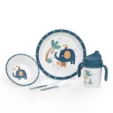 Inclui: copo de treino anti-gotas, prato, tigela, colher e garfo.
