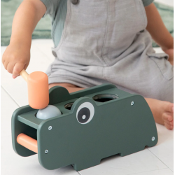 O tabuleiro de martelo de madeira Croco é um clássico para uma criança pequena. As suas funções estimulam a coordenação mão-olho e o sentido da audição quando a criança bate nas bolas com o martelo.