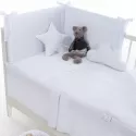Pack berço composto por edredão (capa + enchimento) + protetor, totalmente amovível e reversível, que permite vestir o berço durante todo o ano graças à sua grande versatilidade.
