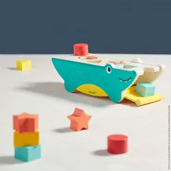 Com a forma de um crocodilo, este brinquedo para a primeira infância tem 8 peças para encaixar: 2 círculos, 2 triângulos, 2 estrelas e 2 quadrados. Cada forma corresponde a uma cor, o que facilita a aprendizagem e a manipulação pelo bebé. Quando o nosso amigo crocodilo tiver comido bem, abrimos-lhe bem a boca para recuperar as peças (abertura magnética). O interior da caixa de formas é revestido de feltro, que amortece o ruído das formas quando caem, para que o bebé possa comer em paz. Este brinquedo estimulante é ideal para crianças a partir de 1 ano de idade, que poderão descobrir formas e cores enquanto se divertem, e desenvolver a sua coordenação manipulando as peças para as encaixar. Este brinquedo é feito de madeira proveniente de florestas geridas de forma sustentável, com certificação FSC®. Tinta à base de água.