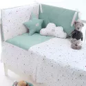 O protetor evita as correntes de ar para o seu bebé e, ao mesmo tempo, protege-o de possíveis choques com os lados da cama, evitando que os seus braços e pés fiquem presos na cama. Esta peça adapta-se de forma segura e fácil à estrutura do berço. O acolchoado tem um desenho coordenado com o protetor. No inverno, o enchimento mantém o bebé quente e aconchegado. No verão, quando o enchimento é retirado, a capa pode ser utilizada como um edredão leve. Certificado Oeko-Tex Standard 100, o que significa que todos os materiais foram testados e não contêm substâncias nocivas. Se quiser, pode encontrar outros artigos interessantes na coleção, na mesma linha e com a mesma qualidade. Tudo fabricado e desenhado em Espanha com os melhores materiais e tecidos da mais alta qualidade.