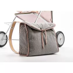 - Carrinho de passeio leve feito à mão em pele de napa rosa pó com interior Vichy em acabamento Seersucker (efeito enrugado) em cru e antracite.