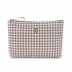 É feito de couro ecológico resistente e macio, estampado com um xadrez vichy e moldado para caber facilmente no saco do enxoval de um lado.