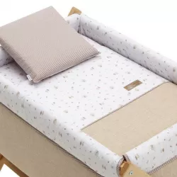 A minicama Cambrass com estrutura em forma de cruz é fabricada em madeira de faia. Permite ao bebé descansar em qualquer divisão da casa durante os primeiros meses de vida graças à mobilidade proporcionada pelas rodas (com travões). Outros aspectos que tornam esta minicama especialmente funcional são a almofada, o colchão e o estrado de madeira de 5 mm, o suporte de madeira e a sua capa cosida que inclui a colcha com enchimento amovível para lavar ou para utilizar no inverno/verão... Conforme recomendado pela regulamentação europeia (EN 1130 UNE-EN 11890:2018) e pelo decreto real 1801/2003 sobre a segurança geral dos produtos, a minicama não pode ser dobrável. De acordo com a regulamentação, este produto pode suportar bebés com peso até 14 kg