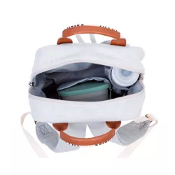 para crianças em idade pré-escolar, dos 3 aos 5 anos. Ideal para transportar tudo o que precisam. Inclui um compartimento especial para a lancheira, um bolso térmico para as bebidas, um porta-cartões para colocar o nome e a morada e um bolso frontal para guardar a chupeta ou o brinquedo preferido.