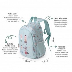 Um bolso frontal, que ocupa quase toda a altura da mochila, com várias divisórias interiores para guardar lápis, talheres e pequenos objectos, que as crianças terão mais acessíveis.