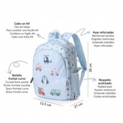 Um bolso frontal, que ocupa quase toda a altura da mochila, com várias divisórias interiores para guardar lápis, talheres e pequenos objectos, que as crianças terão mais acessíveis.