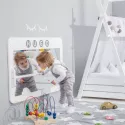 Espelho Montessori Face lacado a branco mate com produtos não tóxicos. Para tirar o máximo partido deste produto, ele foi concebido tendo em conta duas fases diferentes da criança, oferecendo a possibilidade de ser montado tanto na vertical como na horizontal. Em vez de utilizar vidro para o espelho, optou-se por utilizar uma folha de metacrilato (2 mm) com uma película de efeito espelhado. Esta folha é mais flexível e mais leve do que o vidro, para além de ser praticamente inquebrável. 1ªfase - fase infantil. O espelho pode ser fixado na horizontal. Inclui dois apoios laterais e uma barra central, para que o bebé se possa agarrar a ela para se levantar e se ver refletido no espelho. Esta barra pode ser colocada em três alturas diferentes para se adaptar ao crescimento do bebé. A barra superior do espelho foi concebida com uma largura maior do que as restantes para poder acrescentar pormenores com vinil, por exemplo, o nome do bebé. 2ªfase - fase juvenil. Fixação do espelho na posição vertical. Antes de fixar esta posição, recomenda-se retirar os dois suportes laterais e a barra central, alargando o alcance do espelho, deixando um espelho vertical de corpo inteiro para o quarto juvenil. Nesta fase, a barra mais larga é deixada de lado, podendo ser utilizada, por exemplo, para marcar a altura da criança com giz.