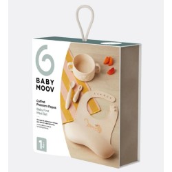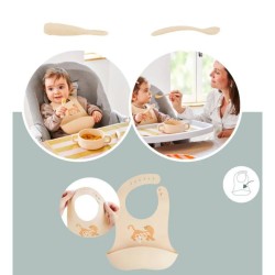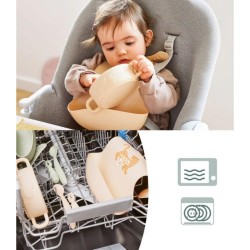 Inclui um babete com pá e fechos ajustáveis, um recipiente com pegas fáceis de agarrar, uma colher para "pais" em silicone macio e uma colher para "bebés" com lâmina plana, desenvolvida com uma terapeuta ocupacional.
