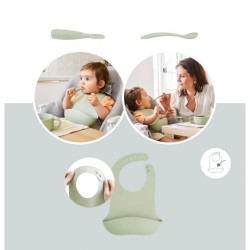 Inclui um babete com pá e fechos ajustáveis, uma tigela fácil de agarrar com pegas, uma colher para "pais" em silicone macio e uma colher para "bebés" com lâmina plana, desenvolvida com um terapeuta ocupacional.