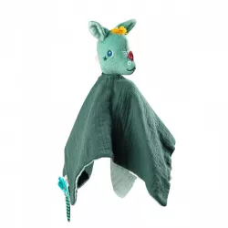 Esta manta de fixação em malha orgânica verde é o aliado de que o seu bebé precisa para o confortar e estar ao seu lado durante muitos anos. A cabeça é um fantoche de mão e tem um nó de tecido para segurar a chupeta. Tem também uma pega e uma etiqueta para escrever o nome do bebé.