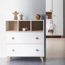Com uma largura de 86 cm e uma prateleira aberta para os seus objectos essenciais, bem como 2 gavetas para uma organização prática.