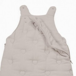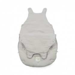 Ha sido confeccionado en muselina en tonos neutros de algodón 100%, extra suave y transpirable, enfocado a la delicada piel del recién nacido. Su diseño sin mangas permite libertad de movimiento y, su cierre con botones a presión en los tirantes, proporciona un ajuste seguro y de fácil colocación. Está configurado para mantener al bebé arropado de manera segura, evitando el riesgo de asfixia con mantas sueltas.