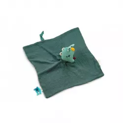 Esta mantita de apego verde de punto orgánico es el aliado que necesita el peque para que le reconforte y esté a su lado durante años. La cabeza es una marioneta de mano y lleva una tela para sujetar el chupete anudándola. Tiene también un asa y una etiqueta para escribir el nombre del bebé.